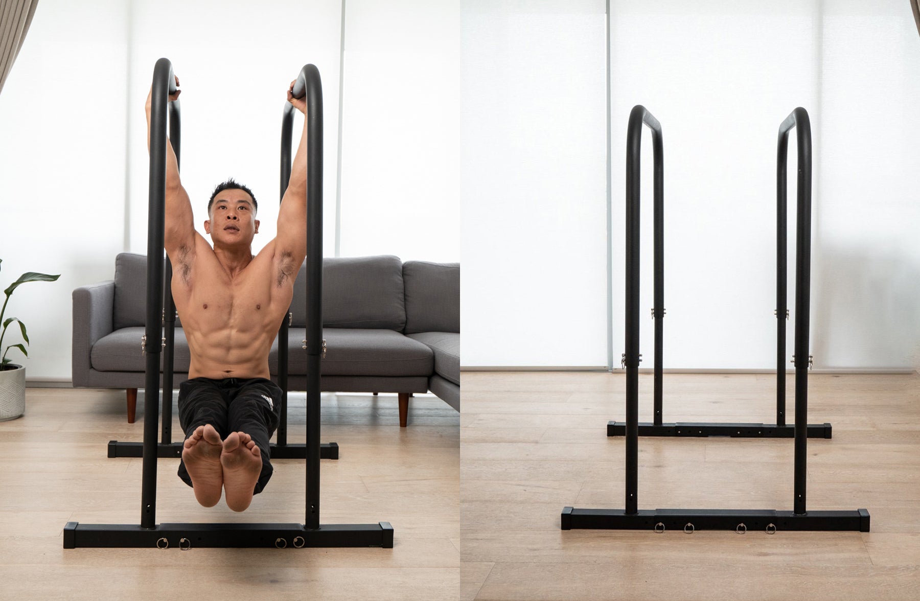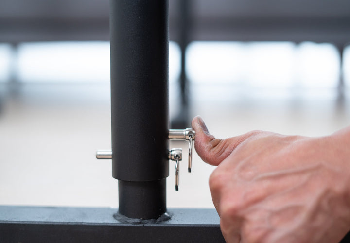 Przechodzi od 91 cm do 129 cm. Zmień wysokość w zależności od ćwiczenia. Ustawienie wysokiej belki zaprojektowane do ćwiczeń na zwisie.
