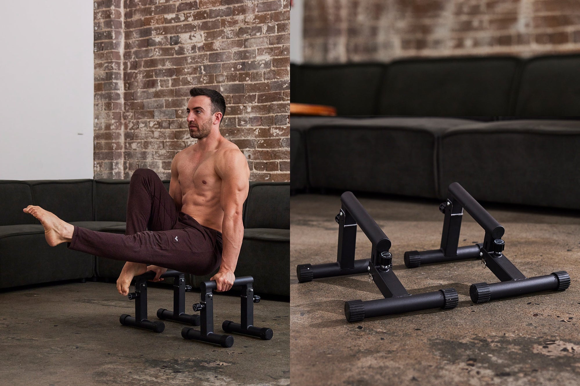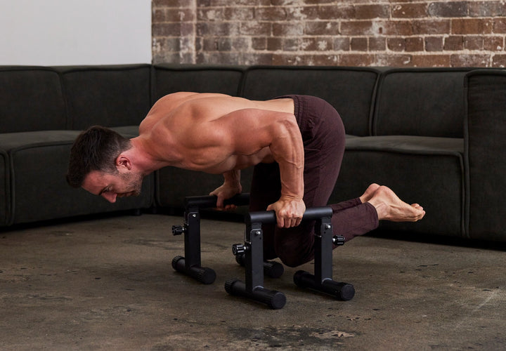 Ćwicz poprzez większy zakres ruchu używając wysokich poręczy. Zagłębiaj się głębiej w swoje ćwiczenia HSPU, pompki i planche.