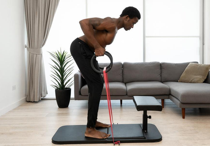 Primarily used for back/pulling exercises and doesn't require much floor space (85 x 88.5cm). Adds core strength to your pull-up by requiring users to hold a tucked/L-sit position. Setup in about 3 minutes and also stores flat with rotating feet. Suitable for any level - easy to scale exercises with bands.